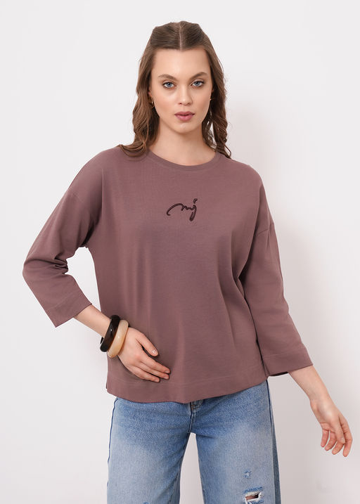 Фуфайка из хлопкового трикотажного полотна умеренного объема. Длинный рукав со спущенной линией плеча. Округлая горловина с обтачкой. Сзади средний шов. По низу рукава и изделия широкая подгибка с разрезами. Спереди вышивка с пеной. 100% Хлопок