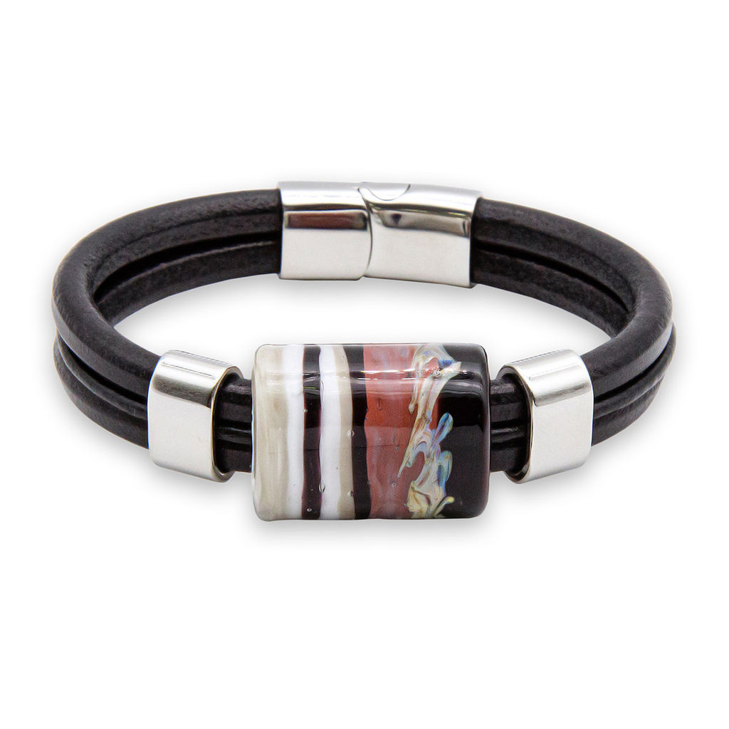 Браслет изготовлен из муранского стекла, натуральной кожи и гипоаллергенной ювелирной стали, что очень важно для людей с чувствительной кожей. Металл не темнеет и не подвергается воздействиям окружающей среды, надолго обеспечивая красивый внешний вид изделия. Крепкий магнитный замок с двойной защитой надежно фиксируется на запястье. Ширина браслета - 1,5 см. Размер стеклянной бусины - 1,9x2,5 см. Вес - 30 гр.
