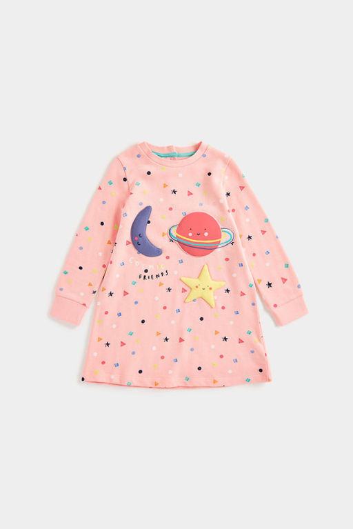 Распродажный ассортимент - это остатки коллекций, выставочные образцы с витрины, товары без упаковки, восстановленные или пользующиеся низким спросом изделия, а также продукция с незначительными дефектами внешнего вида (царапины, потертости и другие особенности). Обращаем ваше внимание, что продукция данной категории возврату и обмену не подлежит. Приобретая товары из распродажного ассортимента вы соглашаетесь на наличие дефектов во внешнем виде или упаковке. - 100% Хлопок_Платье в горошек с принтом "Космические друзья" из ткани с петельчатой изнанкой.­