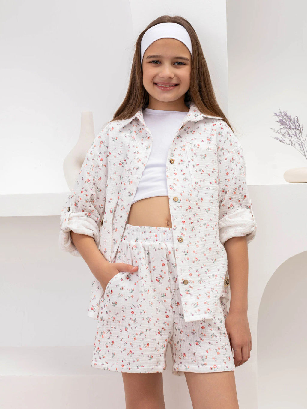 Очаровательный комплект из натурального муслина для вашей маленькой принцессы! В набор входит лёгкая рубашка с милым дизайном и удобные шорты, которые идеально подходят для прогулок, отдыха дома или летних приключений.