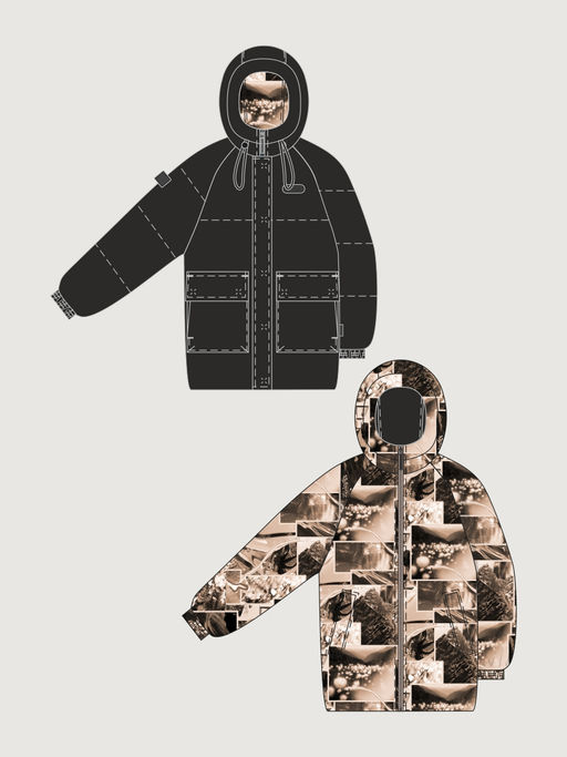 Одна сторона куртки из мембранной ткани 5000/5000 простегана с утеплителем, вторая сторона из плащевой ткани с принтом.