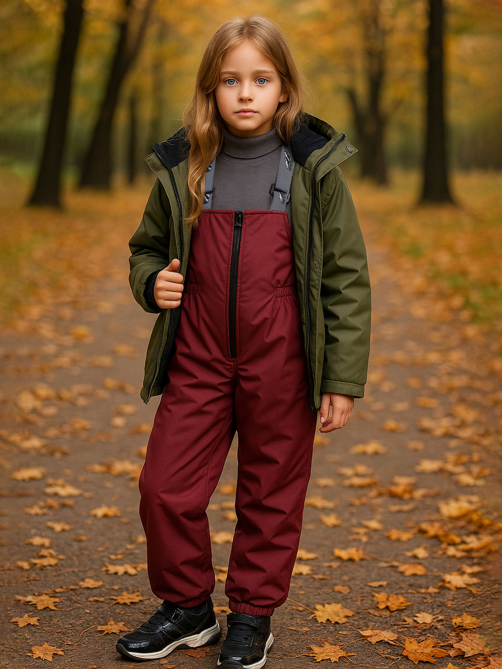 Демисезонный полукомбинезон понравится носить девочке на улице в холодную погоду. Модель выпускается из ветро- и влагозащитной мембраны с утеплителем тинсулейном внутри. В верхней части подклада использован тёплый флис, в нижней – таффета. Изделие имеет регулируемые лямки и резинку в зоне поясницы. Низ штанин посажен на резинку.