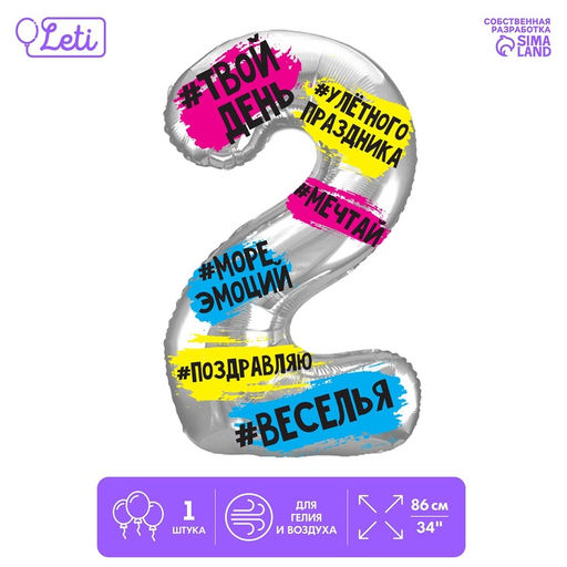 • Цена за 3 шт. Воздушный шар фольгированный 34" «Цифра 2»