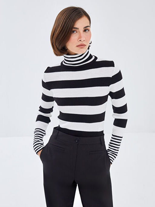Bal?k?? Yaka Renk Bloklu Kad?n Triko Kazak