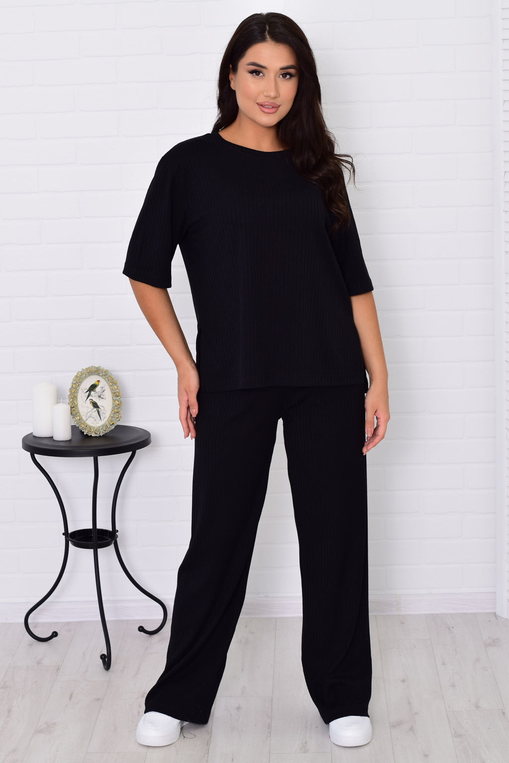 Женский костюм свободного кроя из трикотажа "лапша". Футболка с круглой горловиной и коротким рукавом, по бокам разрезы. Брюки палаццо с высокой посадкой на резинке. Длина футболки по спинке: 42-65 см, 44-66 см, 46-67 см, 48-68 см, 50-69 см, 52-70 см, 54-72 см, 56-73 см. Длина брюк по боковому шву: 42-108 см, 44-108 см, 46-109 см, 48-109 см, 50-110 см, 52-110 см, 54-111 см, 56-111 см. Длина брюк по шаговому шву: 42-78 см, 44-78 см, 46-78 см, 48-78 см, 50-78 см, 52-78 см, 54-78 см, 56-78 см.