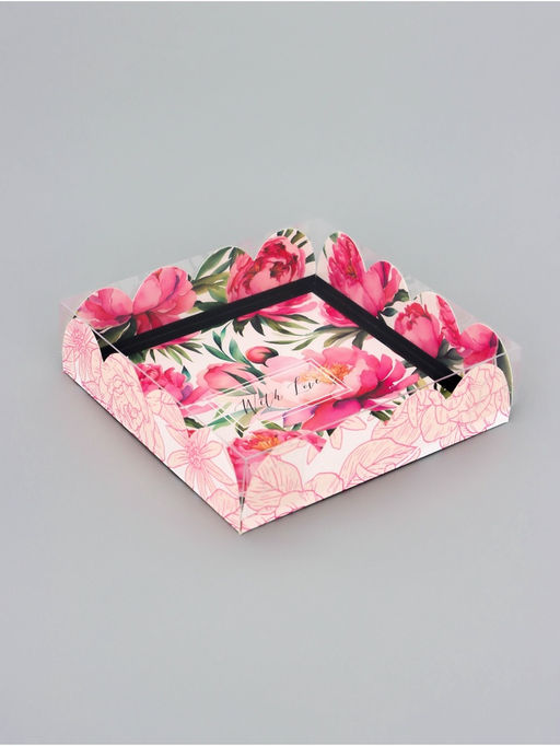 Прочный картон обеспечивает надежную защиту содержимого, а прозрачная крышка позволяет сразу оценить внешний вид угощений без необходимости открывать коробку.