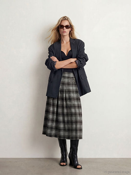 • Y?ksek Bel Ekose Pileli Etek