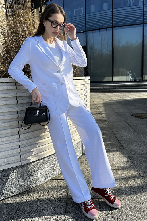 Состав: ПЭ-20%; Хлопок-80%; Костюм Gowear из футера в стиле smart casual поможет создать в меру строгий и одновременно расслабленный образ. Костюм состоит из жакета и прямых брюк. Жакет прямого силуэта с воротником и лацканами, имеет удобные карманы и застежку на 2 пуговицы. На левом лацкане вышивка-логотип в контрастном цвете. Низ и борта имеют открытые края (эффект необработанного шва), укреплены дополнительной строчкой. Жакет без подкладки. Брюки прямые. На передних половинках - отделочная строчка по стрелкам и удобные боковые карманы. Пояс из ткани кошкорсе, с резинкой и контрастным шнурком. Длина жакета по спинке 72-74 см. Длина рукава жакета: 60-62 см для роста 164-170 см, 62-64 см для роста 170-176 см. Полуобхват груди жакета: 42 р - 48 см, 44 р - 50 см, 46 р. - 52 см, 48 р. - 54 см, 50 р. - 56 см, 52 р - 58 см. Длина брюк по боковому шву с поясом: 102-104 см для роста 164-170 см, 105-107 см для роста 170-176 см. Полуобхват бедер брюк: 42 р - 48 см, 44 р - 50 см, 46 р. - 52 см, 48 р. - 54 см, 50 р. - 56 см, 52 р. - 58 см. -- Характеристики -- Состав: ПЭ-20%; Хлопок-80%; Сезон: Весна Рост: 170 Страна бренда: Беларусь