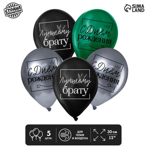 Набор: Да. В наборе, шт.: 5. Диаметр, дюйм: 12. Тематика праздника: День рождения. Адресат: Брату. Тематика рисунка: День Рождения. Вид шара: Классический. Надувка шара: Гелием. Надувка шара: Воздухом. Язык надписи: Русский. Бесплатная доставка: Да. Наша разработка: Да.