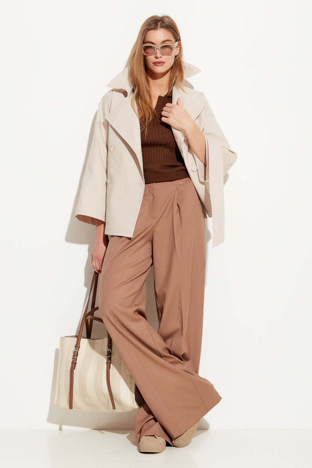 Куртка полуприлегающего силуэта, длиной до середины линии бедер. Воротник стояче-отложной. Линия плеч спущена. Рукава укороченные, широкие. Объем талии регулируется при помощи широкого пояса из аналогичной ткани. Универсальная модель, которая подойдет к любому типу гардероба и защитит от весенней непогоды.
