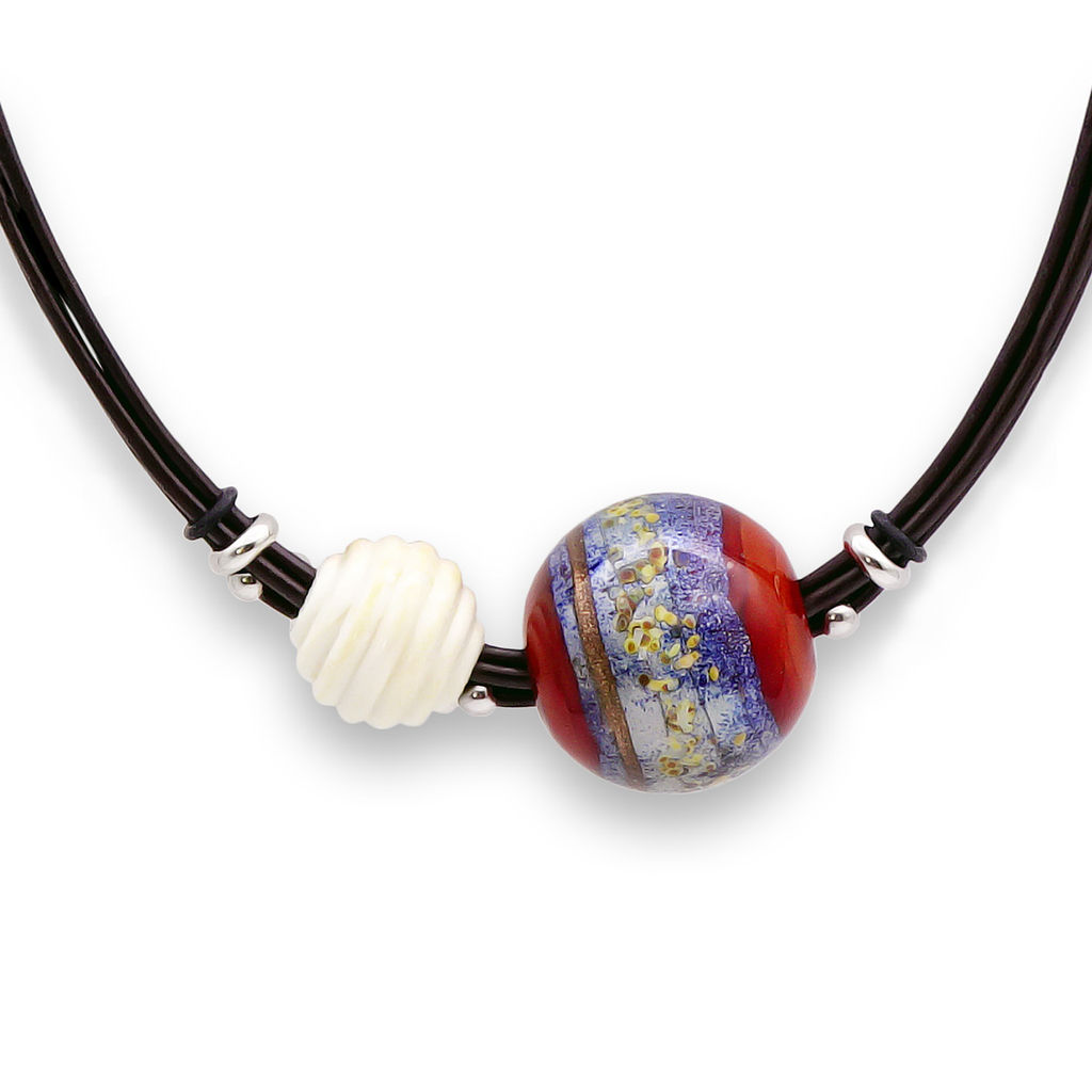 Колье изготовлено из натуральной кожи, муранского стекла и гипоаллергенной ювелирной стали, что очень важно для людей с чувствительной кожей. Металл не темнеет и не подвергается воздействиям окружающей среды, надолго обеспечивая красивый внешний вид изделия. Длина колье - 46 см + 5 см. удлиняющая цепочка. Диаметр стеклянных шаров - 1,5 и 2.5 см. Вес - 35 гр.­
