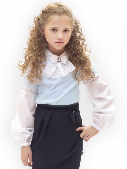 Блуза полуприлегающего силуэта из эластичного сорочечного полотна. Нижняя часть втачного рукава выполнена со сборкой и украшена кружевом. Горловина оформлена со стойкой и украшена декоративным бантом. Состав:55% хлопок, 45% полиэстер