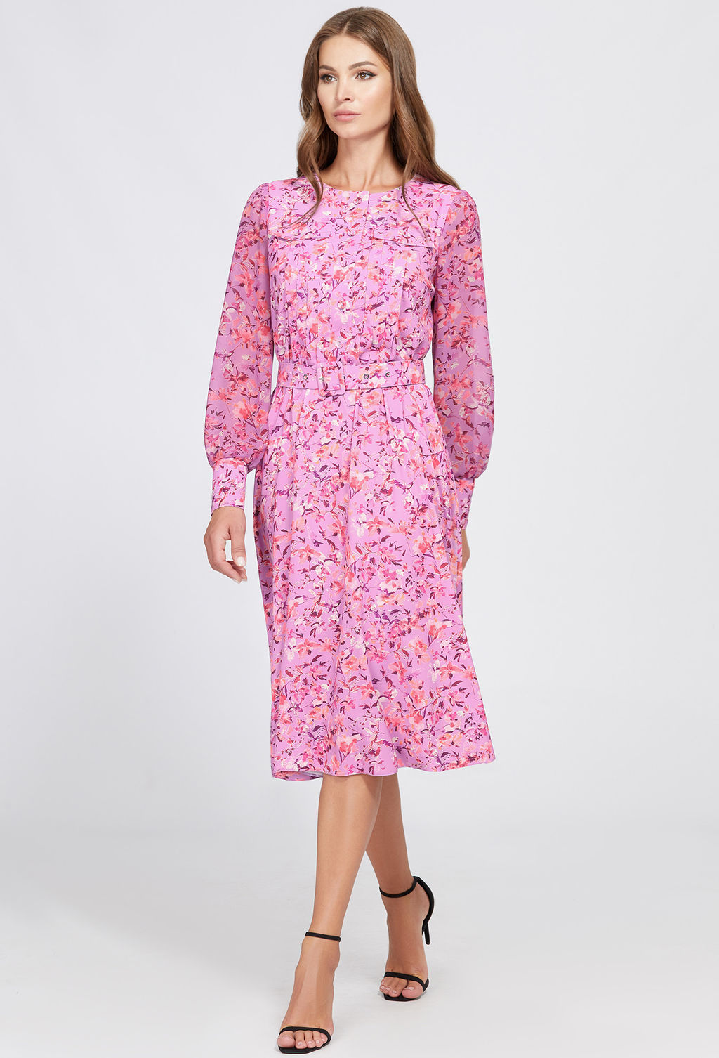 Изящное платье с цветочным мотивом выполнили из мягкой приятной немнущейся ткани. Модель Х-образного силуэта, отрезная по линии талии и собранная на эластичную тесьму, что добавляет удобства и обеспечивает посадку на фигуре. Лиф платья по переду украшен планкой с застёжкой на пуговицы в тон, широкими складками и декоративными клапанами с пуговицами в тон. Лёгкость модели придают полупрозрачные рукава из шифона в тон, сосборенные по низу манжетами из основной ткани с застёжкой на петли-пуговицы. Завершает образ пояс с пряжкой в тон, красиво подчеркивающей талию.