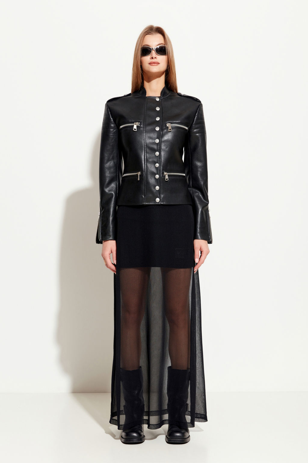 Куртка из эко-кожи, длиной выше линии бедер. Полуприлегающий крой эффектно подчеркивает фигуру. Воротник стойка. Спереди прорезные карманы с акцентными молниями. Застегивается на металлические кнопки контрастного цвета. Стильная модель для создания эффектных весенних аутфитов.