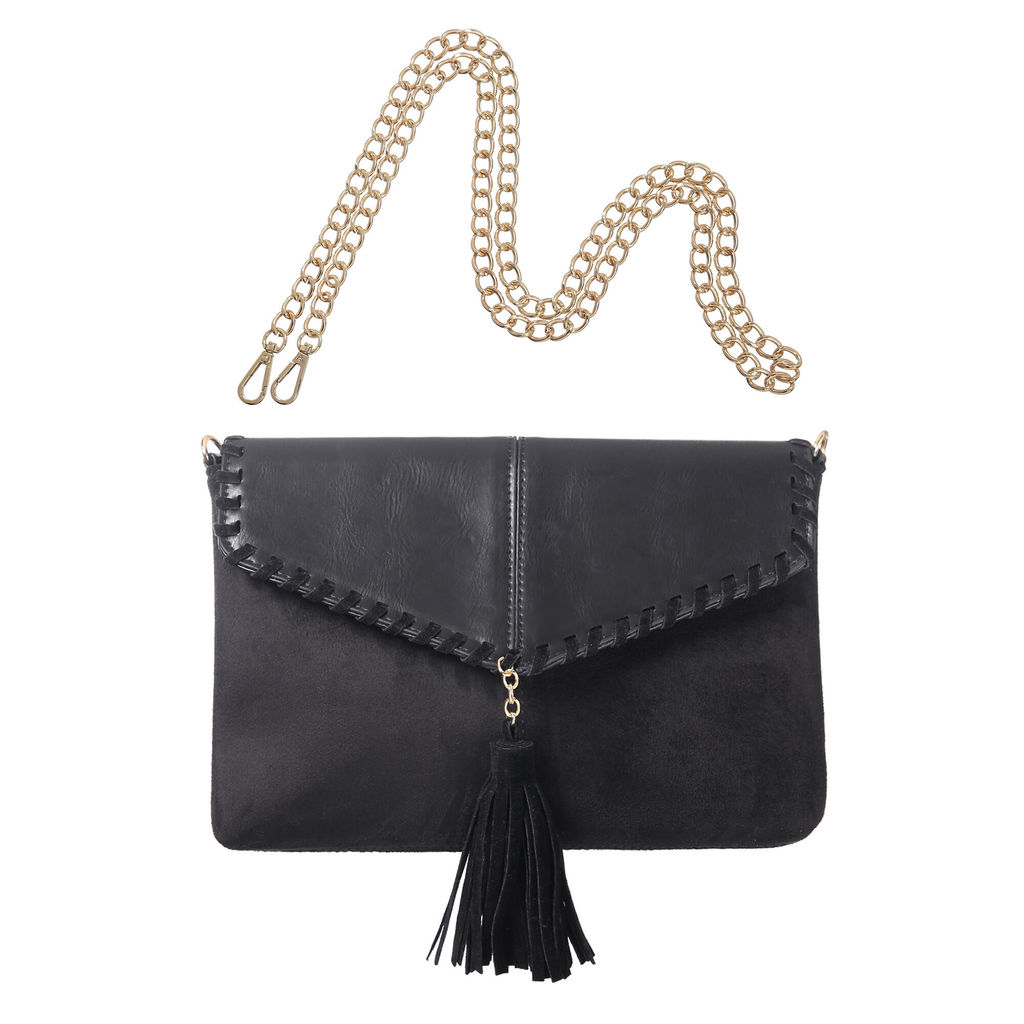 Классический клатч-конверт из искусственной замши черного цвета. Декорирован пушистой кистью из аналогичеого материала. Застежка - кнопка. В комплекте есть длинная цепочка, которая позволяет носить клатч также и на плече. Внутри одно отделение и один карман на молнии. Размер:18 * 25 см