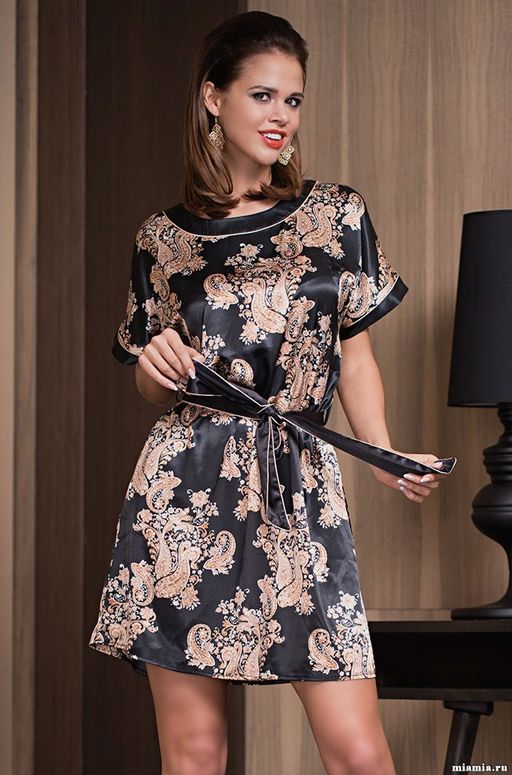Туника Mia-Amore со спущенными короткими рукавами длиной до колен выполнена из смесового принтованного шелкового полотна. Туника по линии декольте, по низу рукавов отделана кружевом. Модель регулируется по ширине принтованным поясом. Состав:70% натуральный шелк, 25% полиэстер, 5% эластан