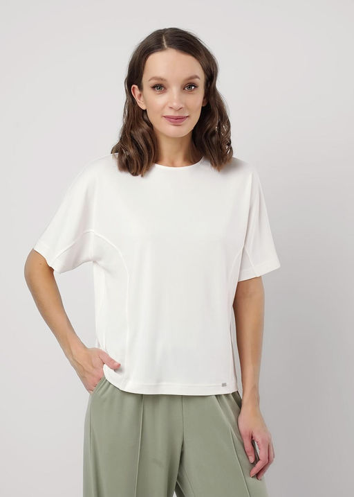 Джемпер прямого силуэта из вискозного трикотажного полотна пике. Короткий цельнокроеный рукав, спереди декоративные отстроченные резы. Округлая горловина с внутренней обтачкой. На спинке средний шов. Спереди нашивка металл.