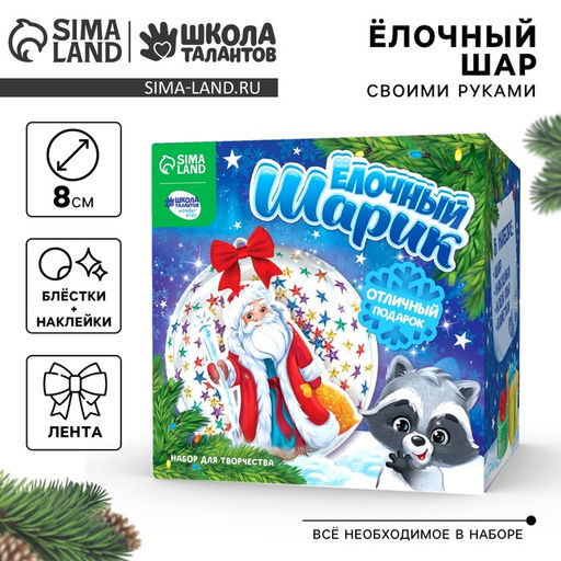 Проявите фантазию и создайте уникальное ёлочное украшение!Нанесите клей на внутреннюю часть половинок шара, засыпьте клей пайетками/блёстками и дайте высохнуть.Аккуратно склейте из двух наклеек персонажа, приклейте фигурку к нижней внутренней части шара. Закройте шар.При желании можно украсить шар и снаружи, используя клей и блёстки.Украша йте ёлочку всей семьей шариками или порадуйте необычным сувениром близких! Набор: Да. Возраст: От 3 лет. Диаметр шара, см: 8. Символ года: Нет. Тематика праздника: Новый год. Для создания: Набор для декорирования. Составляющие набора: Товары для творчества. Бесплатная доставка: Да. Наша разработка: Да. Размеры товара: 8/5.3/8.