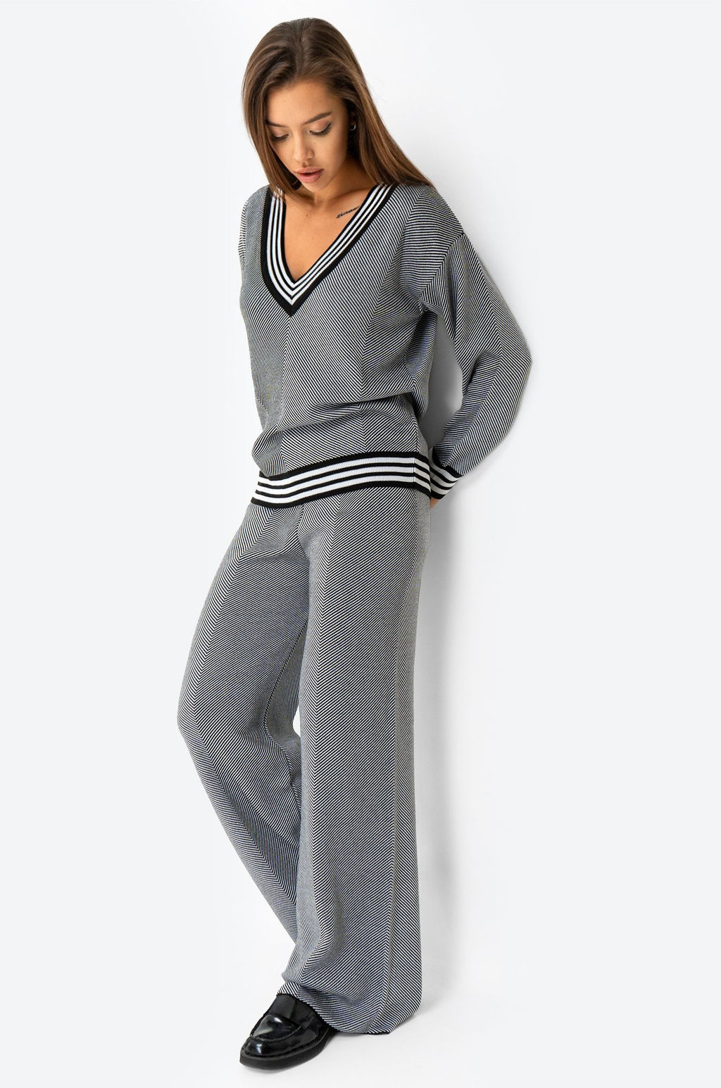 Он точно покорит ваше сердце! Женский костюм из вязаного трикотажа в серых оттенках с диагональной полоской идеальный выбор для стильных и уверенных в себе леди.
