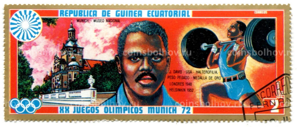 • Марка J.Девис (США) золотов в тяжелом весе (национальный музей Мюнхена) 1972 год Экваториальня Гвинея