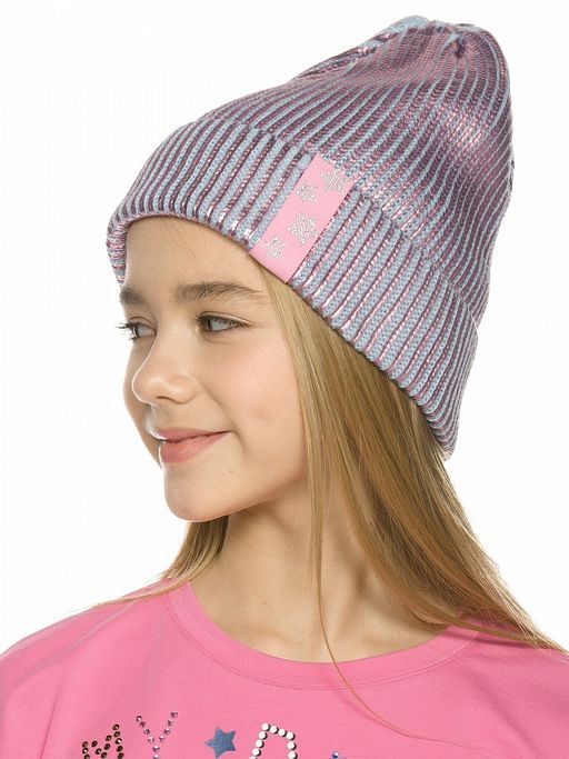 Однослойная шапка из акрила с металлизированным напылением. На отвороте декоративная репсовая лента с принтом из глиттера.