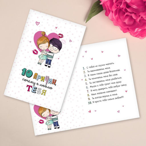 • Цена за 10 шт. Открытка на 14 февраля 10 причин, почему я люблю тебя, фактурная бумага ВХИ, 12?18 см