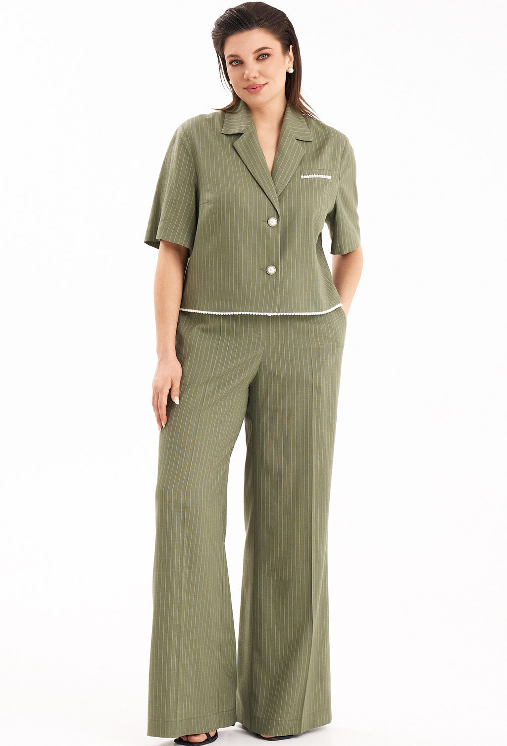 Комплект состоящий из брюк и укороченного жакета. Брюки классического кроя, прямые от бедра с застёжкой на молнию и пуговицу спереди, карманами по бокам и резинкой по поясу сзади.