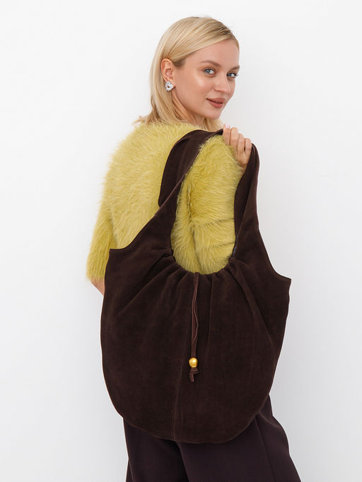 Сумка-хобо, выполнена из замши. Декорирована брелоком. Дополнена золотистой матовой фурнитурой. Данная модель закрывается на молнию. Каркас мягкий. Носится на плече за встроенные ручки.