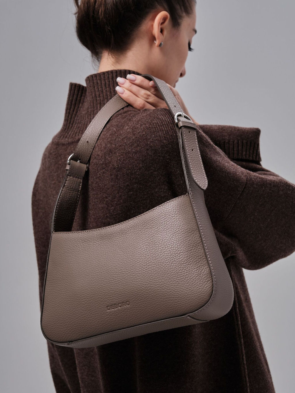 Элегантная женская сумка на плечо Deboro 31046 таупе из натуральной кожи станет незаменимым аксессуаром для современной девушки. Кожаная сумка багет идеально подходит для повседневного использования, будь то прогулка по городу или встреча с друзьями. Благодаря средним размерам, она компактна и вмещает все необходимые вещи: телефон, кошелек и косметику, не создавая лишнего объема и сохраняя элегантность вашего образа. Классический дизайн сумки DEBORO делает ее универсальной - она легко сочетается с любыми образами. Каждая деталь этой модели проработана с вниманием к мелочам, что делает ее не только красивым, но и функциональным аксессуаром. Детали: натуральная кожа, одна несъемная регулируемая ручка, застежка на молнии, одно отделение, внутренний боковой карман на молнии. -- Характеристики -- Цвет: темно-коричневый Материал: Натуральная кожа Бренд: Deboro Тип: Сумка на плечо Страна-изготовитель: Россия Высота, см: 16 Ширина, см: 28 Глубина, см: 10 Материал подкладки: Хлопок Количество внутренних отделений: 1 Количество внешних карманов, шт: 1 Тип застежки: Молния Формат А4: не вмещает Высота ручек, см: 23 Вес товара, г: 410 Ручки: На запястье;На локоть;На плечо;Одна лямка Пол: женская коллекция Группа товара: Сумки