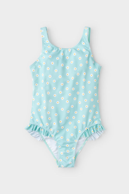 Слитный купальник на лямках для девочки. Украшен бантиками на лямках и оборками по бокам. Оригинальная набивка выполнена из стойких гипоаллергенных красителей.­