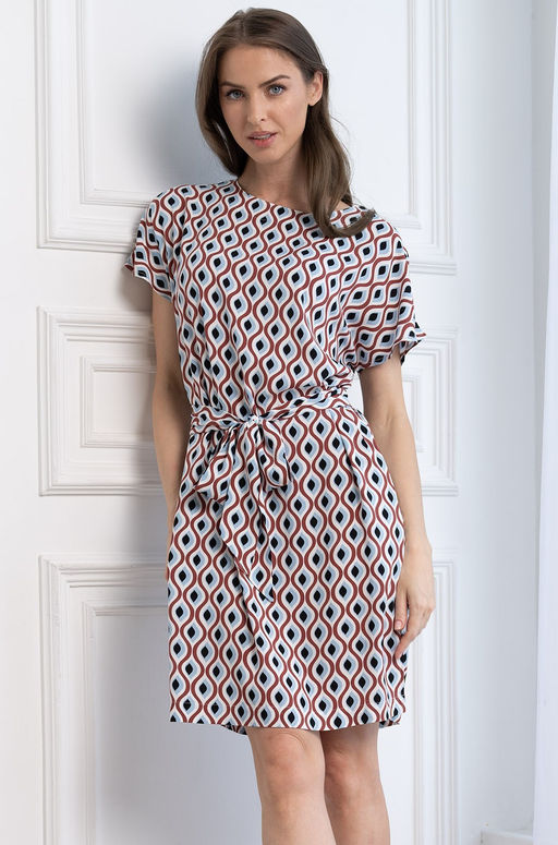 Удобная туника Mia-Amore до колен со спущенными плечами. По талии туника регулируется поясом. В боковых швах есть карманы. Туника выполнена из принтованного вискозного полотна. Состав:100% вискоза