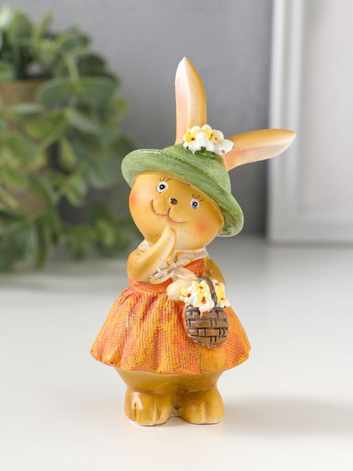 Цена за 2 шт. Фигурка полистоун «Зайка в рыжем сарафане и зелёной шляпке, с корзиной цветов», 4.5×4×10.5 см