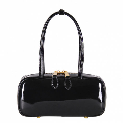 Сумка-такса, выполнена из натуральной лакированной кожи.  Дополнена матовой золотистой фурнитурой. Данная модель закрывается на молнию, носится в руке за встроенные удлиненные ручку. На них имеется фиксатор. На дне предусмотрены ножки.
