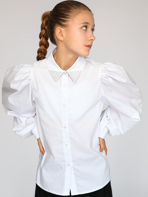 Блузка для девочки Соль&Перец, на пуговицах, из натурального хлопка. Особенностью блузки являются пышные рукава фонарики и отложной воротник украшенный жемчугом, которые добавляют ей изящества и уникальности. Блузка прекрасно сочетается с брюками или с юбкой, подчеркнёт индивидуальный стиль девочки, и разнообразит ее повседневный школьный образ.