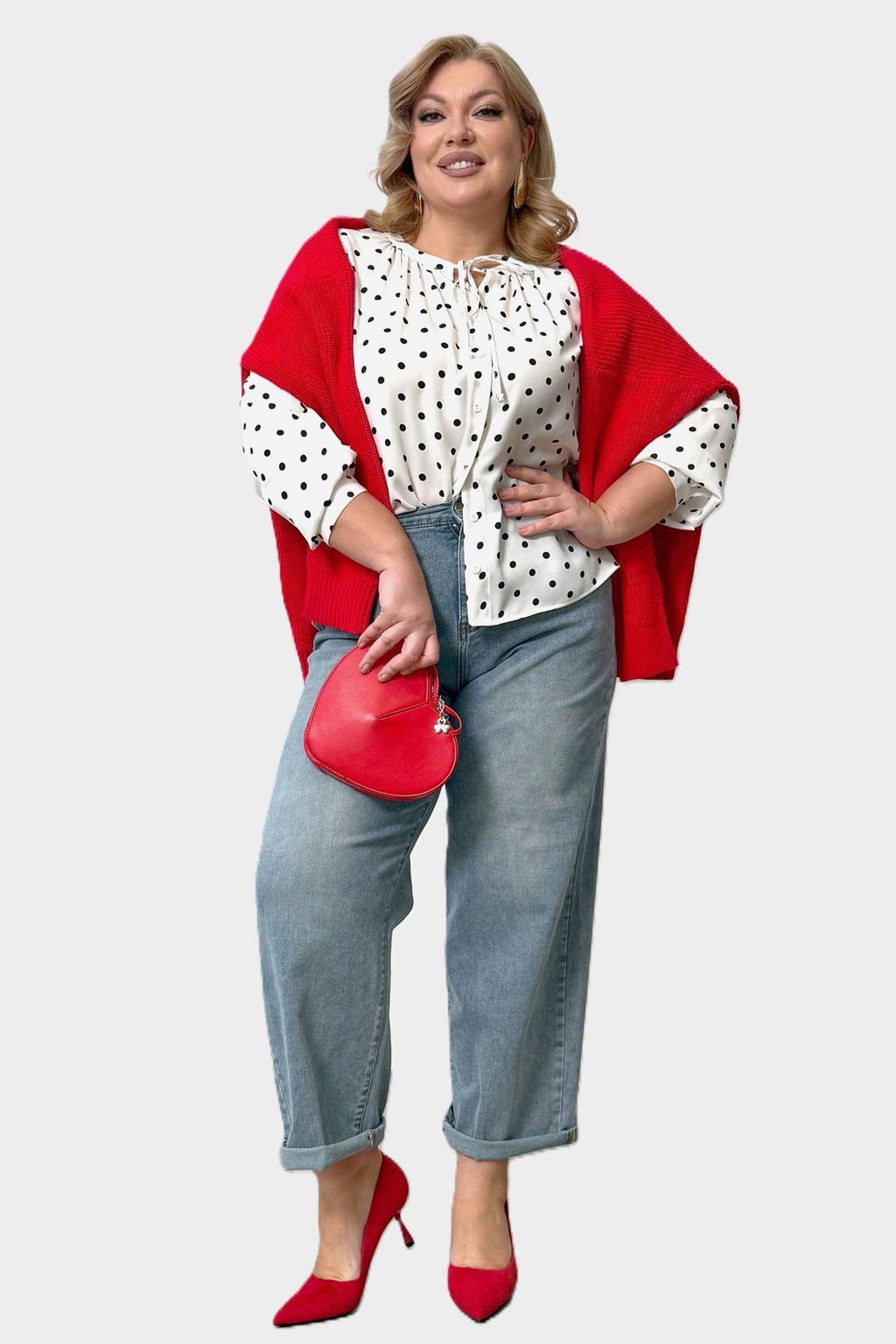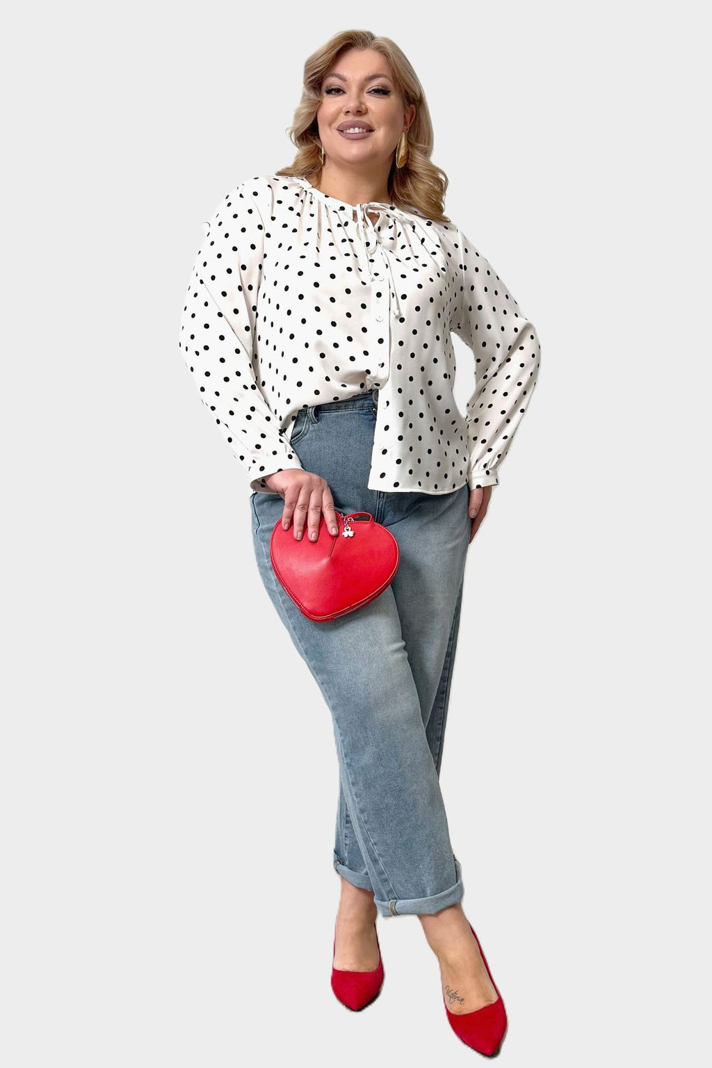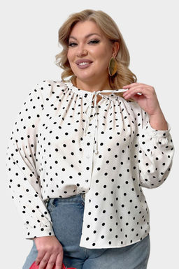 Лаконичная рубашка прямого кроя из мягкого струящегося материала - идеальный вариант для женщин, ценящих простоту и элегантность. Модель привлекает оригинальным дизайном. Рубашка застегивается спереди на оригинальные пуговки под планку. Круглый вырез на груди декорирован завязкой. Рукава полной длины застегиваются на пуговках по низу. Актуальный гороховый принт добавляет динамичности и освежает образ. Свободный крой искусно обыгрывает силуэт, а мягкий, приятный телу материал подарит комфорт на весь день. Отлично подходит для комбинирования с брюками и юбками.­