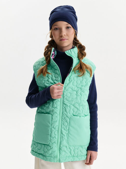 Маркированный товар Состав: 100%полиэстер+мембрана, подклад: 100%полиэстер, утеплитель: 100%полиэстер Жилетка для девочки удобный и функциональный вариант верхней одежды для межсезонья и прохладной погоды. Детская утепленная жилетка выполнена в двустороннем формате, что позволяет менять внешний вид изделия в зависимости от образа и настроения. Жилет детский имеет увеличенный объем и прямой силуэт, благодаря чему комфортно сидит, не сковывает движения и подходит для многослойных комплектов. Модель дополнена накладными карманами, удобными для повседневной носки. Одна сторона жилетки простегана декоративной отстрочкой, вторая выполнена гладкой, без стёжки, что делает модель универсальной и визуально аккуратной. Воротник оформлен в виде высокой стойки, обеспечивающей защиту от ветра. Молния с двусторонним пуллером позволяет легко застегивать жилет с любой стороны, что особенно удобно для двусторонней конструкции. По пройме и по верхнему краю стойки проложен внутренний эластик, который улучшает посадку и комфорт при носке. В качестве утеплителя используется синтепон 60 г/м? в два слоя (120 г/м?) оптимальный вариант для активных детей, обеспечивающий тепло без утяжеления. По низу жилета предусмотрена утяжка эластичным шнуром со стопперами, позволяющая регулировать посадку и защищать от прохладного воздуха. Утепленная детская жилетка для девочки подходит для прогулок, школы и повседневного использования.