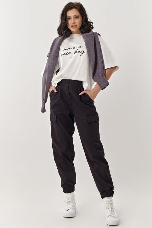 Особенности: Брюки "карго" из хлопковой ткани. Детали: притачной пояс со сборкой на резину и вставкой по переду, защипы по переду, боковые карманы, накладные карманы с клапанами по бокам, притачные манжеты со сборкой на резину. Без застежки..