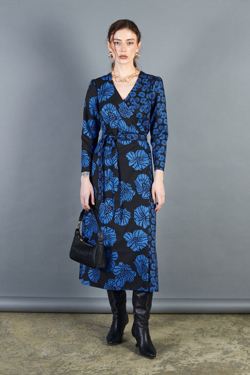 Платье с запахом фиксирующимся притачным поясом выполнено из плательной ткани. Отрезное в области талии. Лиф прилегающий. Юбка летящего силуэта. Укороченный втачной рукав со сборкой по окату.