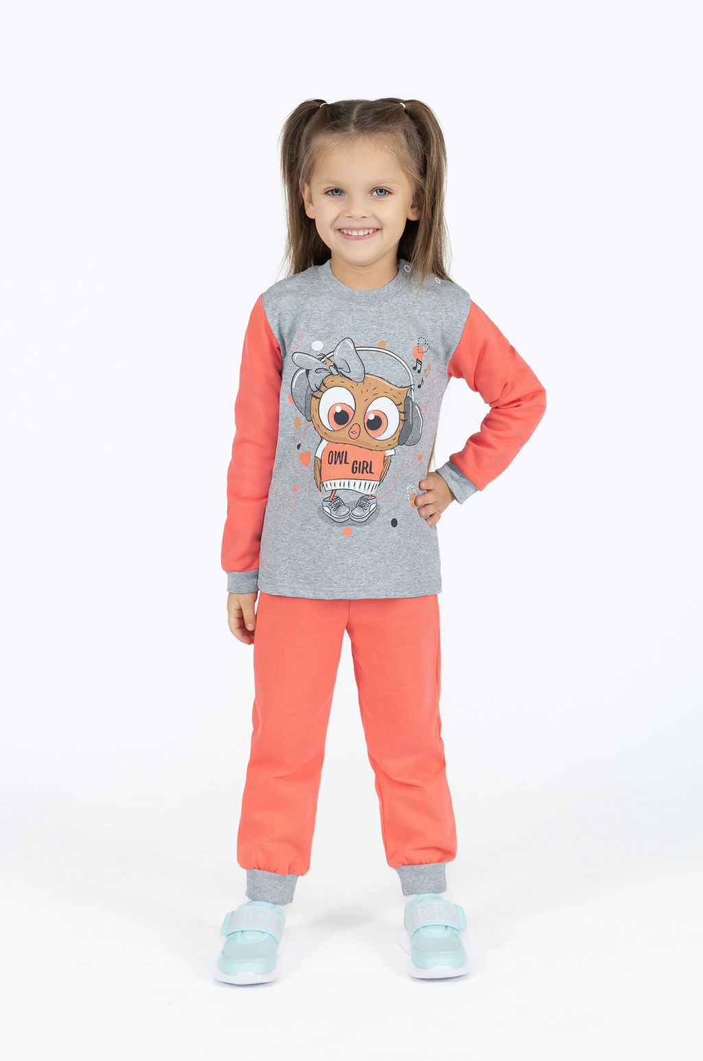 Детский трикотажный костюм пригодится малышам для носки дома или в детском саду. Комплект выпускается из плотного футера с нежным внутренним начёсом кораллового и серого меланжевого цвета. Горловина и манжеты на штанинах и рукавах выполнены из мягкого трикотажа. На плече около воротника расположены клёпки-застёжки. В пояс брюк вставлена резинка. Спереди свитшота принт сова в наушниках.