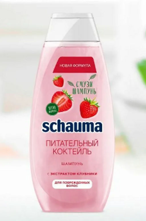 Schauma Шампунь для волос Питательный коктейль Клубника 370мл. Шампунь интенсивно восстанавливает поврежденные волосы, наполняет волосы силой и блеском. Веган формула, без силиконов и парабенов.