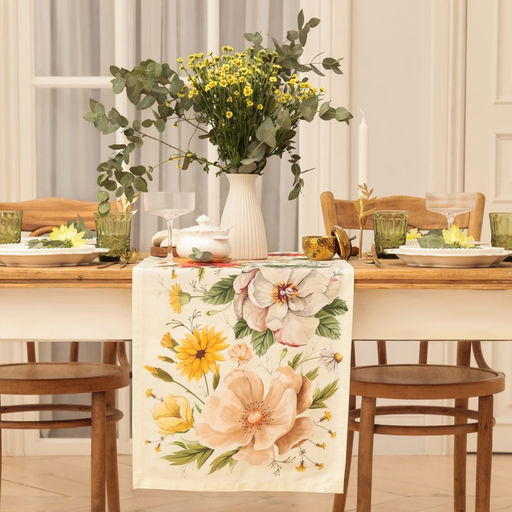 Эта бежевая скатерть-дорожка с цветочным узором станет лёгким и элегантным обновлением для вашего стола. Она создаёт уютную атмосферу для ежедневных завтраков, семейных обедов или особых поводов, таких как 8 Марта или День матери.