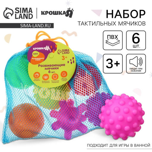 • Развивающие тактильные мячики Крошка Я «В мешочке», с пищалкой, в наборе 6 шт., от 3 лет