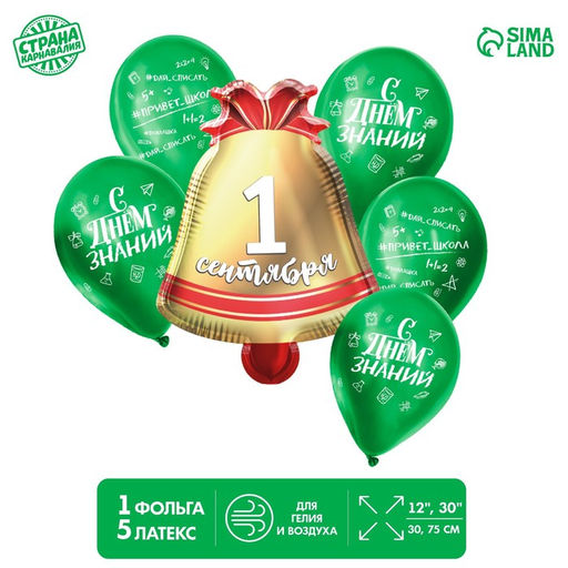 • Шары воздушные, набор «Колокольчик 1 сентября», зеленый, латекс, фольга, 6 шт.