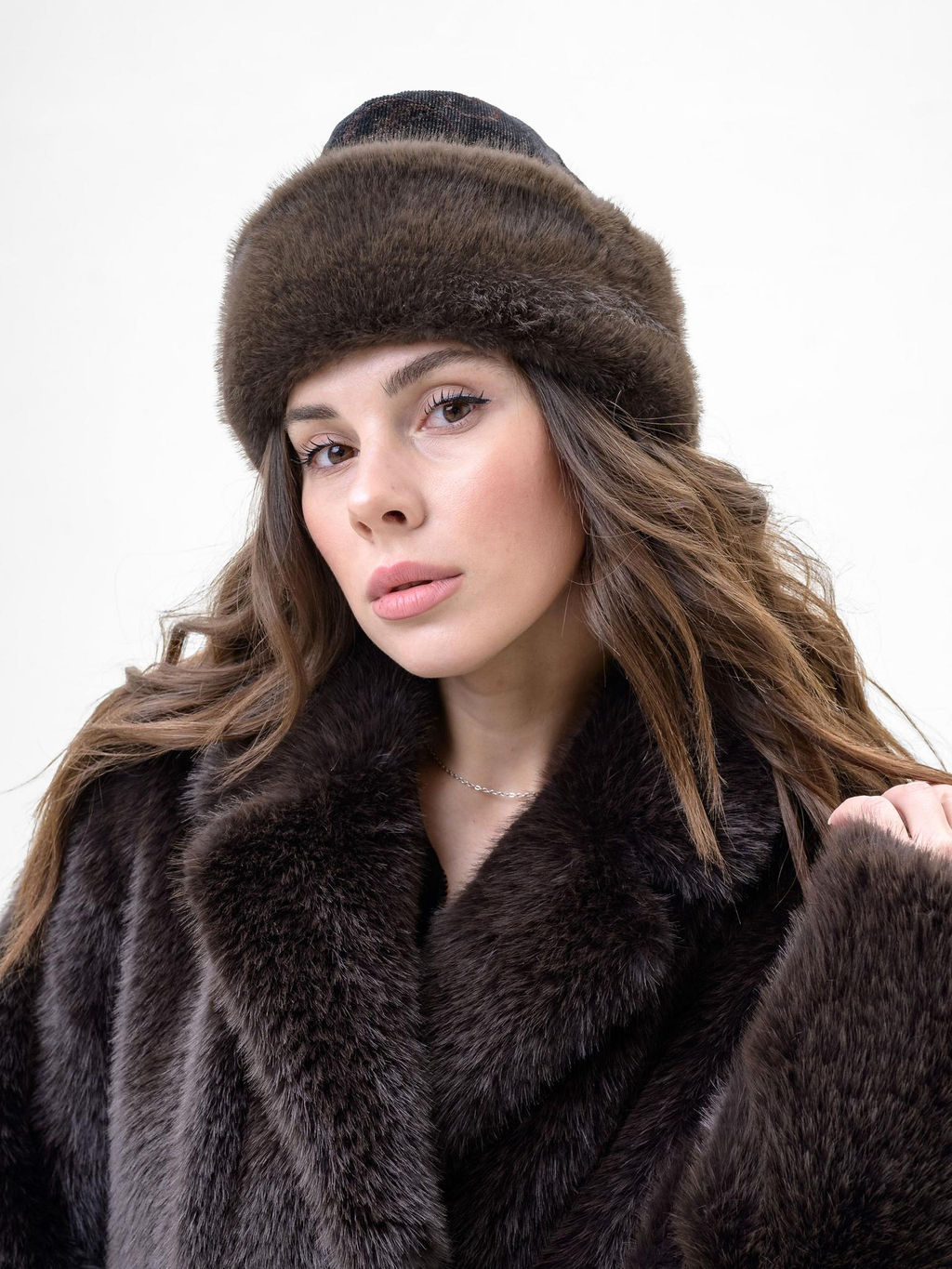 Элегантный зимний головной убор от тм ЭтоЭльф в виде пилотки с меховым отворотом. Вельвет с коричневым принтом и золотым напылением. Отворот выполнен из искусственного мягкого меха под норку коричневого цвета. Утепленный хлопковый подклад. Удобная посадка на голове, внутри предусмотрена утягивающая тесьма для регулировки размера. Уровень отворота также можно регулировать. Высота пилотки 16 см. Яркий акцент к вашему образу, который придаст статности и защитит от зимних морозов!