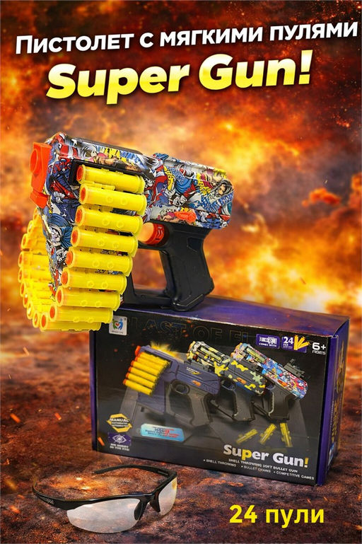 • Стреляющ. мягкими пулями аккумул. 23*17,5см бластер (103A) 24пули в гильзах из ABC-пласт., очки, USB; бегущие огни, выброс гильз, контроль патрона