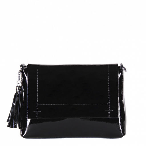 Сумка кросс-боди, выполнена из натуральной лаковой кожи. Декорирована кисточкой. Дополнена серебристой фурнитурой. Данная модель закрывается на клапан. Каркас полужесткий. Носится на плече. В комплекте имеется съёмный плечевой ремень с регулировкой длины. А так же в руке за съемную ручку.
