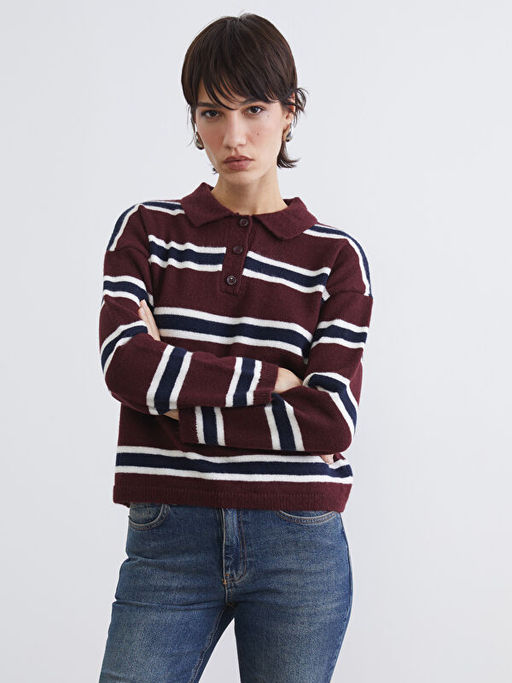 Polo Yaka ?izgili Kad?n Triko Kazak