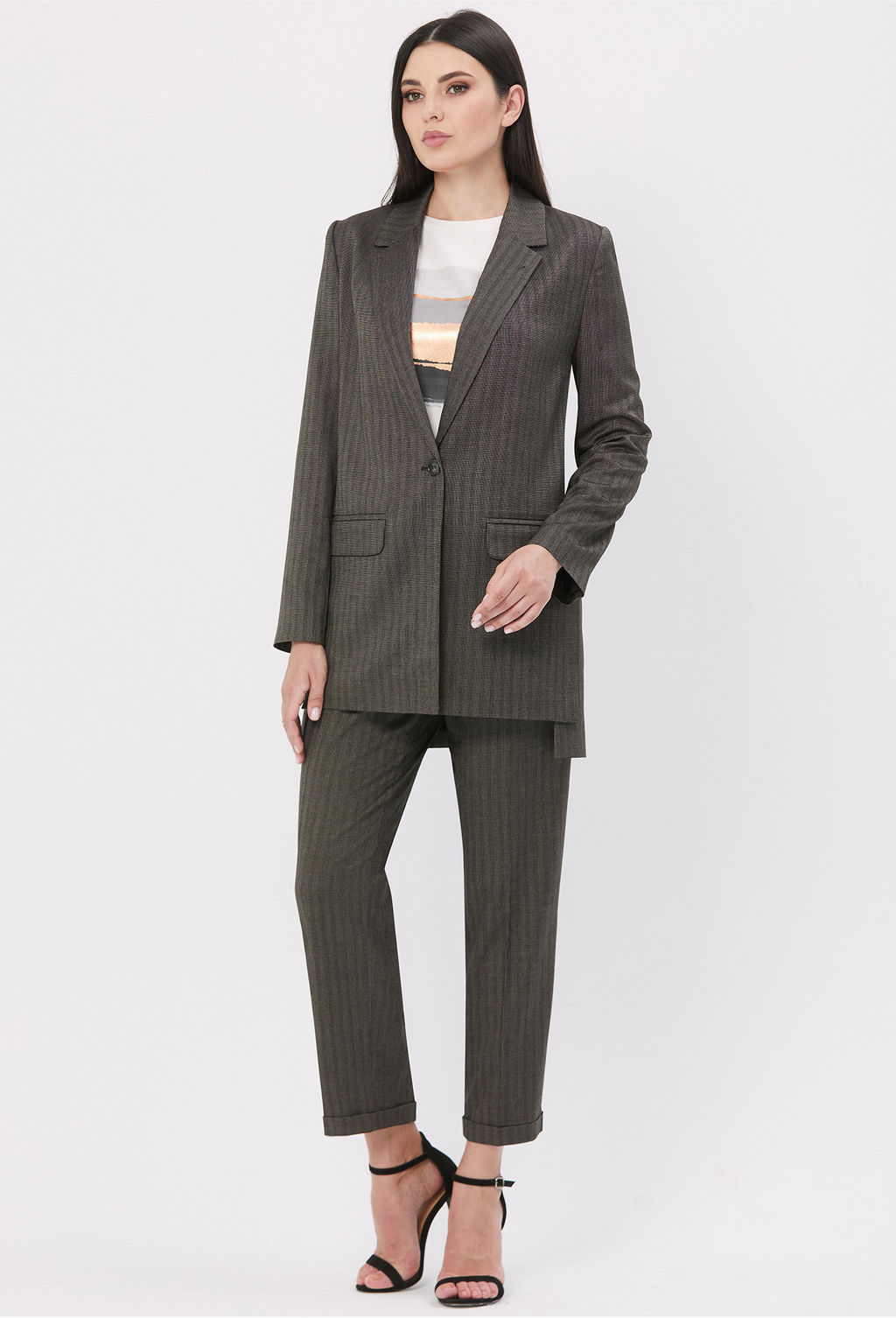 Длина жакета в 46р - 79см, длина рукава - 62см. Брюки - 98см.