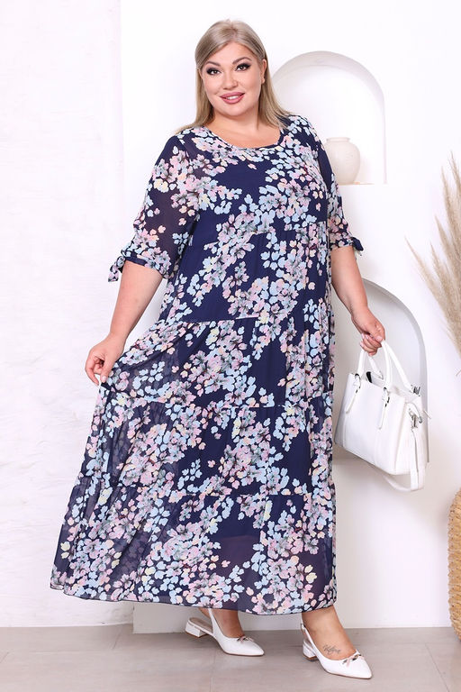 Платье длинное шифон ярусы "Сакура" темно-синее