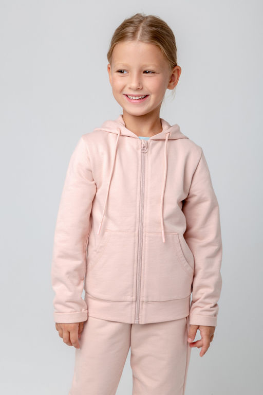 Трикотажная куртка для девочки из петельчатого футера.  Спереди удобные накладные карманы, манжеты и пояс из эластичного трикотажа в рубчик.­